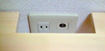 パイン集成材、ウォルナット色の塗装で、棚板(数枚)と側板にコード穴を開けてもらっています。